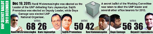 The UNP has decided do away with the clause in its constitution that the party should elect its office bearers, including its leader, through a secret ballot if there is no consensus among the Working Committee members in this regard, party sources said yesterday. The UNP had amended its constitution to include this clause (8: 1) after it was proposed by the committee appointed to introduce reforms. The proposal followed agitation by a section of the party for what it termed the democratisation of the party. The party later voted by secret ballot (on December 19, 2011) and Mr. Ranil Wickremesinghe was elected as its the leader (with 68 votes), defeating Mr. Karu Jayasekara. Mr. Daya Gamage was elected national organiser of the party with 56 votes, defeating Mr. Dayasiri Jayasekara. Mr. Sajith Premadasa became the deputy leader with 50 votes, defeating Mr. Ravi Karunanayake. The faction led by Mr. Premadasa, which is agitating for a leadership change, later disputed the results of the secret ballot. However, the party denied the allegations. After the announcement of the results, there was commotion in the area around the party headquarters’ Sirikotha. Members angered by the outcome even damaged the Sirikotha building. The committee appointed to look into the incident submitted its report to the party’s Working Committee on Tuesday. The committee headed by senior lawyer Srinath Perera recommended that the party do away with the clause that provides for conducting elections by secret ballot annually. Party sources said that the Working Committee had endorsed this report and, therefore, the party would remove this clause. The UNP is to draft a revised constitution with this clause deleted and submit it for approval at the next convention -- which is to be held after the Sirikotha building is repaired. Meanwhile, Mr. Premadasa had reportedly been critical of the working committee report and compared it to the Channel 4 video. He had said that the report was as one sided as the video. Mr. Premadasa had expressed this opinion at the party’s working committee meeting on Tuesday. According to informed sources, the UNP deputy leader had said that the committee appointed to look into the stoning of Sirikotha had gone beyond its mandate in proposing that the present office bearers continue in office until the nest presidential election and general election are concluded, and that the necessary amendments be made to the party constitution. Mr. Premadasa had asserted that the constitution should remain unchanged, and the office bearers elected annually in accordance with it.. Source: Daily Mirror - Sri Lanka