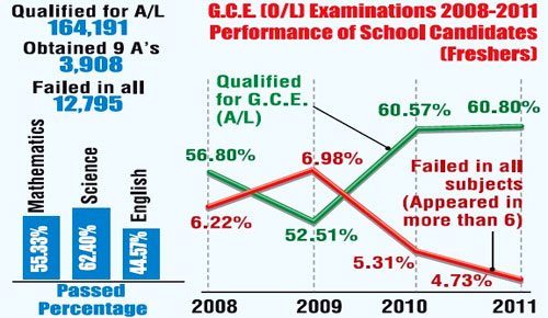 More than five per cent of the candidates who sat the GCE O/L examination in December last year have failed in mathematics, Education Ministry statistics revealed yesterday. According to these statistics only 55.3 per cent or 148,940 students had passed in mathematics last year while 60.3 per cent or 269,167 of the students had passed this subject in 2010. Education Minister Bandulla Gunawardene told a media conference that memorizing the periodic tables would be made compulsory for all students. He said Tamil medium students had a better knowledge of periodic tables than the Sinhala medium students and assured he would setup mathematics labs in 1,000 schools under the government’s special development programme. The minister said with a 62.4 per cent passing in Science and 44.5 per cent in English the pass rate had improved last year when compared with the previous year, which had a pass rate of 61.7 per cent in Science and a 42.3 per cent pass rate in English. Nearly 2,001 students in the Western Province obtained 9-As while 507 students obtained 9-As in the Southern Province, 462 in the Central , 103 in the Northern, 148 in the Eastern and 291 in the North Western Province. Eighty four students had obtained 9-As in the North Central Province with 86 in the UVA Province and 226 in the Sabaragamuwa Province. Nearly 2,692 students in the Western Province had failed in all subjects while in the Northern Province 646 had failed in all subjects had the lowest number of such failures. The minister said the results of 462 students had been withheld and of this number 32 students have been from Neluwa Vidayalaya in the Galle District. Results had been withheld for various reasons and he said inquiries would be held to find out why this happened. Visaka B. M. V. student Udeshika Hettiarachchi came first in the Island while Anusha Perera of Science Vidyalaya was placed second. Third place was shared by Bharatha Rankothge of Dharamaraja Vidyalaya Kandy and Samandika Wimalaratne of Pinnawala MMV Rambukana. Source: Daily Mirror - Sri Lanka