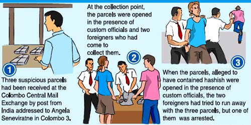 The Police Narcotics Bureau (PNB) has informed Court that its detectives would use CCTV cameras set up at the Colombo Central Mail Exchange to trace the foreigner with regard to the hashish case, who had managed to escape from legal custody. At the collection point, the parcels were opened in the presence of custom officials and two foreigners who had come to collect them. The parcels when opened were found to contain 366.70 grammes of hashish concealed inside magazines In this case, the PNB detectives informed Court that three suspicious parcels had been received at the Colombo Central Mail Exchange by post from India addressed to Angela Seneviratne in Colombo 3. The postal authorities had informed the addressee to come to the Mail Exchange to collect the parcels. At the collection point, the parcels were opened in the presence of custom officials and two foreigners who had come to collect them. The parcels when opened were found to contain 366.70 grammes of hashish concealed inside magazines. Filing a further investigative report in Court, the PNB informed Colombo Fort Magistrate that the suspect Josh Kerr Wilton had accompanied the Britisher Brutton Saul Felix (already in custody) to the Colombo Central Mail Exchange to collect three parcels addressed to film actress Angela Seneviratne. When the parcels, alleged to have contained hashish were opened in the presence of custom officials, the two foreigners had tried to run away with the three parcels, but one of them (Brutton Saul Felix) was arrested. The suspect Brutton Saul Felix was ordered to be remanded till May 8. According to PNB further investigative reports, the two foreigners had arrived in the country on April 4 this year and were staying in a residence located at Hudson Road, Colombo 3. Meanwhile, the PNB informed Court that they would send the substance concerned to the Government Analyst in order to get an analytical report. Further magisterial inquiry into the matter will resume on May 8. Source: Daily Mirror - Sri Lanka
