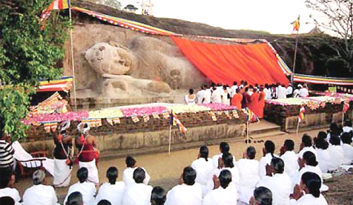 The recently discovered Buddha Statue in the Tanthirimale sacred area has been restored to be conserved. At the time of discovery, the statue was damaged, probably by treasure hunters. The ceremony of unveiling the restored statue for worship was held on Vesak Poya day (5) evening. The restoration of the statue was done under the supervision of the Archeological Department on guidance of the National Heritage Ministry. The restoration of the statue commenced following a request made by the Thanthirimale Raja Maha Vihara Chief Incumbent and the North and East Deputy Sanga Nayaka Ven. Thanthirimale Chandarathana Thera to the President Mahinda Rajapaksa. This ancient striking statue, 45 feet long was created on a stone plateau towards the northern slope of it. After the Anuradhapura reign this statue was hidden by a dense forest. When it was discovered some years back, the face with a part of the head, the upper part of the right hand and the head- rest was severely damaged by treasure hunters. According to the archeologists these damages seemed to have been caused during the 19th century. The area was first discovered and named as a sacred place by the late Ven. Kudakonegaskada Wimalagnana Thera in 1960s. Subsequently the damaged statue was restored to a certain extent by the archeologists. The present Thanthirimale Raja maha Vihara Chief Incumbent Ven. Chandarathana Thera is making a great effort to develop this ancient sacred place. The restoration work is a part of the development activities inaugurated by him. A prominent sculptor S.A.GAYan has restored the head of the statue protecting its ancient craftsmanship under the guidance of the Archeological Department. There are only two other statues of this nature in Sri Lanka considering the size and marvelous art of sculpture, namely the sleeping pose at Gal Viharaya in Polonnaruwa, Buduruwagala says the Archeological Director general Dr. Senarath Disanayake. There are more similarities between the Polonnaruwa statue and the Thanthirimale statue says the Director General. The ceremonious for the unveiling of the statue was done by the Ministry of National Heritage Secretary Ms Kanthi Wijetunga, After the unveiling, floral pooja was offered to the statue by the Ministerial Secretary, Archeological Director General Senerath Dissanayake, Senior Assistant secretary of the Ministry Vijitha Nandakumara , Addition secretaries D.G. Samarasinghe,and Sujatha Corey, Anuradhapura Additional District Secretary P.hettiarachchi. Archeological Assistant Director Mahinda Weerakkody, North Central Dy. Chief Secretary Keerthi Gamage, and several security forces officials, and devotees. Source: Daily Mirror - Sri Lanka