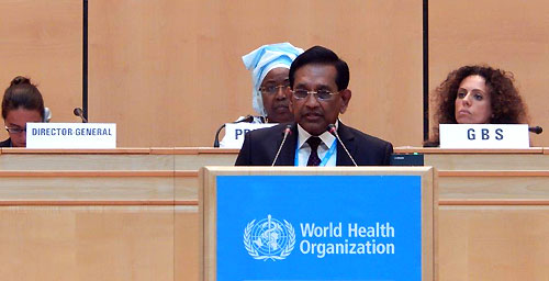 Minister of Health and Indigenous Medicine Dr. Rajitha Senaratne today (19 May 2015) addressed the 68th World Health Assembly held in Geneva and highlighted the progress Sri Lanka has made in achieving the Millennium Development Goals and universal health coverage, particularly with respect to Maternal & Child Health and the control of communicable diseases. Highlighting the health scenario in the country he said that under the guidance of President Maithripala Sirisena, the country is poised to enter a new phase of health development and pointed out that the health burden of the country is now moving more towards non communicable diseases, such as cardiovascular, respiratory neoplasm and diabetes, which account to over 70% of deaths. Addressing the Assembly, Chancellor of the Federal Republic of Germany Angela Merkel, praised the role of the WHO and said "The WHO is the only international organization that has universal political legitimacy on global health issues,”. The meeting was also addressed by Hon. Jagat Prakash Nadda, President WHA, Dr. Margaret Chan, DG/WHO and a large number of Health Ministers from Member countries from all over the world. Full text of the speech: Plenary Statement By Hon. Dr. Rajitha Senaratne, the Minister of Health and Indigenous Medicine, Sri Lanka While associating myself with the NAM and the G- 15 statements, I wish to congratulate Hon Jagat Prakash Nadda, Minister of Health of India, on his election as the president of the 68th World Health Assembly. Along with my fellow Ministers present here today, may I also take this opportunity to convey our condolences to the government of Nepal and its people for the sad loss of life and property due to the recent earthquake. Sri Lanka took measures to mobilize our experienced emergency rescue and relief teams within 24 hours of this calamity, to support Nepal and its people, in their hour of need, and I wish to offer our continuing support to face the wide ranging challenges faced by the nation. I also wish to take this opportunity to thank Dr. Margaret Chan, Director General of WHO and Dr. Poonam Singh our Regional Director, for their continuing guidance and support to the development of the Health Sector in Sri Lanka. The active role played by the WHO in bringing all the countries to a common platform to fight disease and promote health, has been truly remarkable and in fact commendable. Under the guidance of our newly elected President Maithripala Sirisena, who was in fact the Minister of Health until early this year, we are poised to enter a new phase of health development entwined with new challenges. As in many other countries in the region, in my country too, the health burden is now moving more towards non communicable diseases (cardiovascular, respiratory neoplasm and diabetes), which account to over 70% of deaths, while, Injuries and mental health issues are also becoming significant. These are resource intensive, and hence we are planning to increase our health budget significantly, and also to strengthen our partnerships. Sri Lanka has had its free health service since the 1930s. The Sri Lankan health system is developed on a platform of efficient and effective primary health care, where equity is a central consideration. The grass root level workers such as Public Health Midwives and Pubic Health Inspectors visit every household to advice on maternal and child health, elderly care, sanitary practices, nutrition, and control of communicable diseases. This, along with the high level of female literacy, has contributed to our achievement of good health status at a comparatively low cost. We are set to achieve nearly all the MDGS by the end of 2015, and in areas such as Maternal and child health we are looking beyond the MDGs. We have eradicated polio over two decades back in 1992, and the last indigenous case of malaria was reported in October 2012. Sri Lanka is expected to be certified as “malaria free” later this year. Considered a preferred destination to study health systems, Sri Lanka recorded the highest number of visits from across the Region in 2014. When it comes to a resilient health system, Sri Lanka can be considered a global example and its resilience was demonstrated on several occasions. When the Tsunami devastated the country in 2004, when we were still having an internal conflict in our North and East, showcased the resilience of our health system. The health services managed the post-tsunami period without a single serious disease epidemic. Then in 2008, the Ministry of Health established the Disaster Preparedness and Response Unit and prepared the National Health Sector Disaster Preparedness Plan, which is in operation today. Today, Sri Lanka is determined to build a more robust and resilient health system, through the strengthening of primary level health care, and access to emergency care at all levels. Our new accident and emergency care policy identifies how specialized care institutions will be able to respond better to the emerging epidemiological and economic challenges by reorganizing and strengthening emergency care at basic levels and with specially trained personnel. We have just established a New Medicines Regulatory Authority to ensure the quality of medicines and devices and make them available at affordable prices. Meanwhile, Sri Lanka pioneered in the launch of the National Assessment Report on Implementation of Global Strategy and Plan of Action on Public Health, Innovation and Intellectual Property in March 2015. This was undertaken in line with the recommendations of the 61st WHA in 2008. The assessment brought together active engagement of diverse institutions and ministries for identification of clear and implementable policy recommendations for health products innovation. In conclusion, I would like to thank the WHO’s for its role as the leading global health authority. We are proud and ready to be associated with the WHO and other international global 