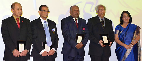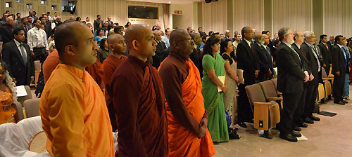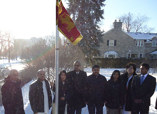 The official segment of the programme included the National Anthems of Sri Lanka and Canada sung by children of the Sri Lankan Expatriate Community, hoisting of the national Flag, observing two minutes silence in honour of those who sacrificed their lives to preserve and protect the country, multi-faith religious observances and reading of the National Day Message of His Excellency the President in all three languages. The Conservative Member of Parliament for Don Valley East Constituency, Hon. Joe Daniel addressed the audience to convey his greetings and urged the Sri Lankan expatriates living in Canada to invest and extend their support to their country of origin. In her address High Commissioner Chitranganee Wagiswara referred to His Excellency President Rajapaksa’s message where he spoke of freedom in the true sense of the word that requires economic prosperity which should benefit all citizens in the country. She also spoke of the prevailing peace and reconciliation in Sri Lanka which has to be built “one step at a time”. Referring to internal and external elements who try to derail the peace and progress in the country, she called upon the Sri Lankan expatriate community to join hands and to contribute to greater prosperity, peace and reconciliation in Sri Lanka. A significant aspect of this year’s celebration was to recognize Sri Lankan Canadians who have brought honour to their country of birth by being recipients of the Governor General’s Award or the Queen’s Jubilee Awards in recognition of their services and contribution to Canada. Dr. Sange de Silva, Dr. Nimal Ratnayake, Mr. Ganesan Sugumar, Mr. Upali Obeyesekere, Mr. Kula Sellathurai, Mr. Melwyn Machado, Ms Winifred Wijay and Mr. Piyasena Gamage were presented with awards by the High Commissioner. A short Cultural Show was also staged by the children and artistes living in Ottawa. The evening ended with a reception hosted by the High Commission for nearly 400 participants. A short Official Flag Hoisting and Religious Ceremony was held at the High Commissioner’s Residence on 4th February 2013, to mark the National Day. It was followed by multi-faith religious observances with the participation of the Members of the Staff and Office Bearers of the Sri Lankan Associations in Ottawa.