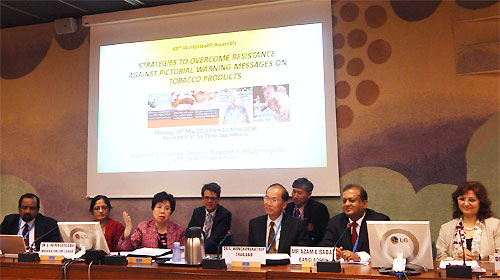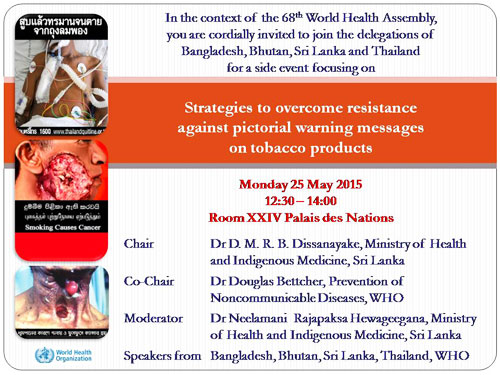 Dr. Margaret Chan, the Director General of the World Health Organization (WHO) has said "“Pictorial warning is the most cost effective means of controlling tobacco related Non Communicable Diseases (NCDs), including cancer “, and that "countries can get return on their investment in multiple areas". Paying tribute to countries including Sri Lanka whom she said "had the courage to keep going despite heavy resistance by the tobacco industry", Dr. Chan said "without our joint effort, you know what effect tobacco would take. We should not allow an industry to intimidate governments, make money and leave you with all the health consequences". She urged that "the international community come together to fight the tobacco industry". Dr. Chan made these observations when she inaugurated a session on the theme “Strategies to overcome resistance against pictorial warning messages in tobacco products”, hosted by Sri Lanka on the sidelines of the 68th World Health Assembly at the Palais des Nations in Geneva on Monday (25th May 2015). This was the first ever side event hosted by Sri Lanka during an annual assembly. Thailand, Bangladesh, Bhutan and the WHO co-sponsored the event to show case problems encountered when taking steps to implement pictorial warnings in cigarette packets and how Sri Lanka, Thailand and Bangladesh as well as other countries had overcome the resistance. Lessons learnt will be useful to other member states. A documentary produced by Sri Lanka named “Against the tide” depicted the resistance encountered. The steps taken by Sri Lanka were appreciated by all who attended. Delegates from member states attended the event. Among the speakers were Dr Luminita SANDA, WHO/PND, Medical Officer presenting the "overall global view", Sri Lankan perspective by Dr V.T.S.K Siriwardana, Director, Noncommunicable Diseases, Dr. Suriya Wongkong Kathep Deputy Permanent Secretary, Ministry of Public Health, Thailand and Azam-E-Sadat, Deputy Secretary (WHO),Ministry of Health & Family Welfare, Bangladesh. The session was moderated by Dr Neelamani Rajapaksa Hewageegana /Deputy Director General of Health Services Planning. Speakers noted that the tobacco epidemic will cause the most harm to low- and middle-income countries, and that every death from tobacco products is preventable. Understanding this fact 56th World Health Assembly on 21 May 2003 adopted a treaty, The World Health Organization Framework Convention on Tobacco Control (WHO FCTC) to protect present and future generations from the devastating health, social, environmental and economic consequences of tobacco consumption and exposure to tobacco smoke by enacting a set of universal standards stating the dangers of tobacco and limiting its use in all forms worldwide. Regulations to introduce pictorial health warnings on tobacco packages was a step in this regulation.