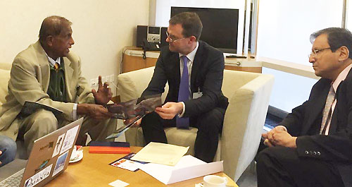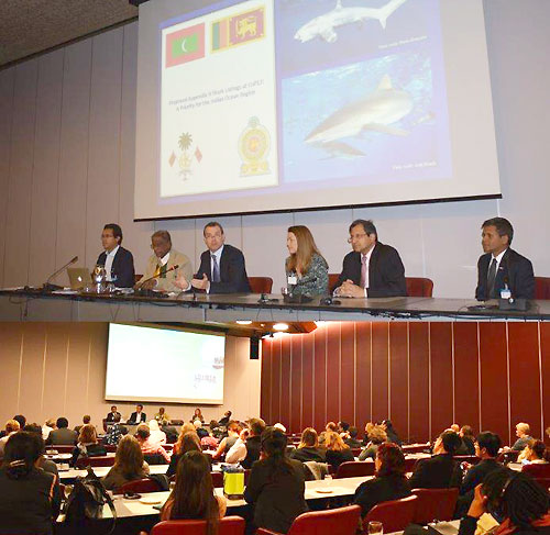 Minister of Sustainable Development and Wildlife, Mr. Gamini Jayawickrama Perera has re-iterated Sri Lanka's commitment to protect endangered wildlife species. He said consistent with this policy, the Government had decided to destroy a confiscated blood ivory shipment on 26th January 2016 at the Galle Face Green in Colombo. The consignment consists of 359 pieces of blood ivory, equalling 1.5 tonnes. The Minister made these remarks during his meeting with the Secretary – General of the Convention on International Trade in Endangered Species of Wild Fauna and Flora (CITES) Mr. John E. Scanlon, on the side-lines of the 66th Standing Committee meeting of CITES held in Geneva last week. Since ratification of the CITES Convention in 1979, this is the first time Sri Lanka has been represented at a Ministerial level at any meeting of this important global convention. Sri Lanka's Permanent Representative to the UN in Geneva, Ambassador Ravinatha Aryasinha, Second Secretary of the Permanent Mission in Geneva Mrs. M.L.F. Mafusa, and Advisor to Minister Mr. Daniel Fernando were associated with the Minister. In 2012, Sri Lanka Customs forfeited a blood ivory shipment, with a total of 359 pieces of ivory. Addressing Member States and civil society representatives, Minister Jayawickrama Perera said that “this event will highlight to the world, and to everybody within our country, that we will not tolerate any illegal trade of ivory”. The ivory stock will be publicly destroyed, with religious offerings to mark the unnecessary sacrifice of those elephants. Secretary – General Scanlon agreed to participate in this event and will call on the President, Prime Minister, and meet other key officials to discuss further cooperation under the Convention. During the 66th Standing Committee meeting, Sri Lanka also announced its proposal for listing of three thresher shark species (“Kassa Mora”) under CITES Appendix II, which will be considered at the CoP17 meeting in September 2016 to be held in Johannesburg, South Africa. Sri Lanka also co-hosted a side–event on the 14th January 2016 alongside the Maldives, who have also submitted a proposal to list silky sharks under the same convention, to highlight the importance of listing both these shark species. The Secretary-General of CITES, inaugurating the event, highlighted the successes of the previous shark listings at CoP16. Addressing the event, Minister Jayawickrama Perera said “With 100 million sharks killed each year, strong action is clearly needed to protect them wherever they are found, and the Government of Sri Lanka is joining the global battle to save sharks and rays found at home in the Indian Ocean, and all around the world”. He urged other countries to work together with Sri Lanka on the proposal submitted and encourage sustainable trade for these species. Delegates from member states and civil society representatives who attended the side-event expressed notable interest in supporting the proposal. Minister Jayawickrama Perera also held bilateral consultations with a number of countries to seek their support for Sri Lanka’s proposal on listing these shark species, as well as to explore other avenues of future bilateral cooperation in the conservation of wildlife species in Sri Lanka.