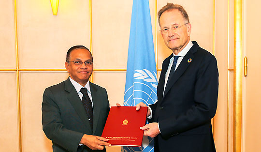 Ambassador A.L.A. Azeez presented Credentials today, (12th April) to Mr. Michael Møller, the Director-General of the United Nations Office in Geneva, accrediting him as the Permanent Representative of Sri Lanka to the United Nations in Geneva. Welcoming the new Permanent Representative, Director General Mr. Møller apprised him of the diverse areas in which his Office remained engaged in Geneva and highlighted the integrated SDG Lab, Gender Parity Campaign, and UN Strategic Heritage Plan as among the important priorities. He called upon Sri Lanka to contribute towards the advancement of these initiatives while continuing the leading role that Sri Lanka has played in the field of disarmament and other areas. Ambassador Azeez elaborated the measures taken by the Government of Sri Lanka to advance SDGs as well as the ongoing programmes and plans aimed to improve the socio economic conditions of the people. He reiterated that it was the policy of the Government of Sri Lanka to remain engaged in constructive dialogue and cooperation with the United Nations, in a manner that advances the welfare of all Sri Lankans. A career Foreign Service Officer with 26 years of experience, Ambassador Azeez previously served as the Permanent Representative of Sri Lanka to the United Nations Organisations in Vienna from 2011 – 2015. He coordinated EU related matters and multilateral treaties, acting as Additional Secretary in the Ministry of Foreign Affairs immediately prior to his new assignment. In Vienna, he had held the Chairmanship of the Group of 77 and Working Group of the Comprehensive Nuclear Test-Ban Treaty (CTBTO), in addition to the Presidency of the United Nations Industrial Development Board and the General Conference of the International Atomic Energy Agency (IAEA). comments powered by Disqus |
