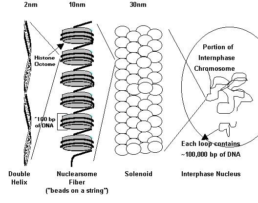 Fig. 12, shows the organisation of DNA needed to fit into a chromosome. A structure called the nucleosome is the fundamental packaging unit made up of eight proteins called histones. The first step in the packaging is the tight coiling of 146 base pairs of the DNA strand twice round the surface of the histone disc. This is followed by 60 base pairs of loose DNA thread followed again by a 146 base pair histone disc and so on, giving a beaded appearance 11nm thick as shown. The nucleosomes are packed further together with the aid of another histone to form a 30nm wide fibre. This fibre goes into further coiling to give a thickness of 300nm and loops further to reach a thickness of 700nm, the bindings for the loops provided by nonhistone proteins.