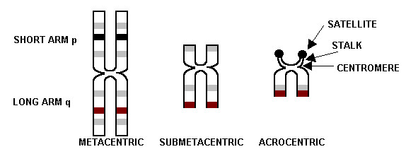 Depending on the position of the centromere, the chromosomes may have short arms (p) or long arms (q). Depending on the position of the centromere, human chromosomes are divided into three types. Fig. 14.