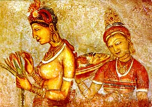 o adorn the "mirror wall" of the rock fortress Sigiriya in the northern plains of Sri Lanka. Painted in brilliant colors on mirror-finished plaster wall, some believe that they are asparas, heavenly nymphs. Perhaps they were ladies of the court on their way to the temple or even ancient "pinups" for the entertainment of the lonesome young ruler. Painted during the reign of King Kasyapa in the fifth century (A.D.), these frescoes have retained their brilliant colors until this day, protected from the sun, wind, and rain by the overhanging rock. Accompanying these frescoes are graffiti left by the ancient visitors, that are considered to be some 1,000 or more, years old. Although these speak of "five hundred damsels", today there are only eighteen to be seen. Note: Some 30 years ago, in 1967, vandals succeeded in obliterating several of these priceless frescoes, but with the help of the Smithsonian Institution in Washington D.C. they were restored to their former splendor.