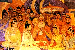 Bellanwila Raja Maha Viharaya houses a series of painted murals depicting several episodes in the life of the Gautama Buddha. The largest of the murals - a full 6 metres by 14 metres, is a single unified composition depicting 13 episodes in the life of the prince, from early childhood up to the time of his enlightenment. These include Siddhartha's education in music and the arts; his training as a young warrior in the martial arts, archery and swordsmanship, his marriage ceremony, his indulgence in sensual pleasures, his experiences traveling outside the place grounds (where the young prince witnessed the suffering that encountered him to seek a way to end all suffering), his association with hermits, ascetics and philosophers, and finally, his achievement of nirvana.