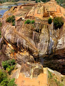 Lanka. It is this very feature that drove young prince Kasyapa, after killing his father King Dhatusena, by entombing him alive, to this lonely rock in the jungle to hide from his older brother who was gathering an army to retake the throne. Kasyapa while in self imposed exile made his new kingdom as liveable and pleasant as possible by surrounding himself with his loyal followers, and for his personal enjoyment, what could only be described as "pinups". These frescos are to this day preserved in a grotto in the sheer west face of the rock.