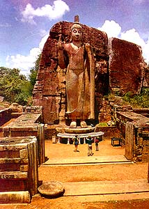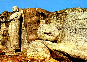 Polonnaruwa. The standing figure some 23 feet (7 meters) high is believed to represent Arahath Ananda, Lord Buddha's favorite deciple. The reclining statue, some 46 feet (14 meters)