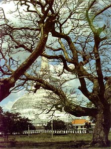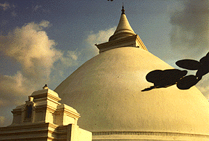 Popularly regarded as the greatest, and certainly the most popular among the Buddhists, of the stupas at Anuradhapura, Ruwanveli Seya, is the pride of the Great Emperor Dutugamunu. Raised in the 2nd century B.C. this dagoba is supposed to have the perfect water bubble shape. There are four gate houses marking the outer walls of this magnificant structure, and within the courtyard a receantly built "elephant wall" upholds the dagoba platform. Among the many statues in the courtyard there is one that is of a larger-than-life man. This is considered to be the king himself watching his work from a respectable distance.
