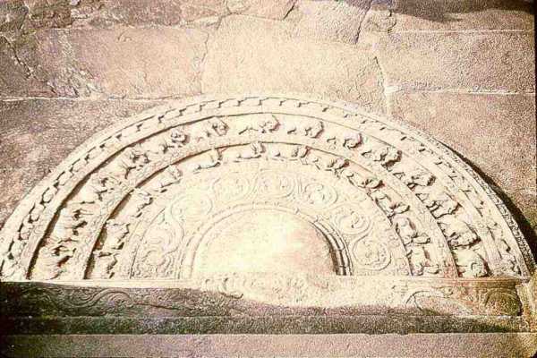 Moonstones and Guardstones are generally found at entrances or at the bottom of stairways to temples, shrines, dagobas, and other important buildings. These are considered to be the most characteristic forms of classical Sinhala sculpture. Moonstone is a semi-circular slab of stone with richly carved bands of animals, lion, bull, elephant and horse in particular. A close inspection of these bands will reveal that each pose of each animal is slightly different to the previous pose, almost like the adjoining "cels" in a Disney cartoon.