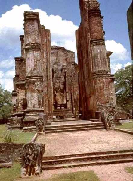 This massive brick structure in Polonnaruwa is part of the Alahana Pirivena, a 12th century monastic complex. The building stands about 170 feet long, 60 feet wide, and about 60 feet high. The interior walls of the building still has traces of murals that once decorated them. A headless statue of a standing Lord Buddha in the back wall dominates the image house. Note the two guardstones on either side of the stairs.