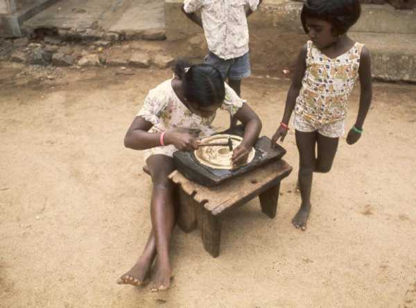 The art of making these beautiful trays, like the art of creating with lacquer, is passed on from father to son, or from one family member to another. When the father is busy tending to the needs of the small farm or the few milk cows, the daughter or the son can take over seamlessly. Here the big sister has taken over the from the father, while the little future designer is anxiously looking on for her turn. The design is usually a stylized lotus flower, created free-hand, often from memory and is hammered on using a nail with a smooth end to a thin brass or copper base secured on a soft wax base.