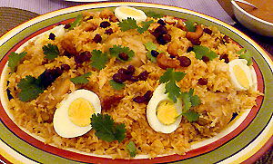 2 Cups Basmati Rice 4 Cups water 3 medium onions, chopped 2 tomatoes 4 tablespoons Buriyani Mix (Mate Brand is reccomended) 3 boiled Eggs 2 Chicken thighs and legs, precooked for 6 minutes (3 minutes on each side) in microwave. 4 tablespoons of Butter Vegetable oil