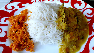 METHOD In a dry bowl take two cups roasted rice flour (flour should be fine & free flowing without clumps). Add 1 tsp table salt, mix well. Let 4 cups of water boil vigorously. Gradually add the boiling water to rice flour until you can form a dough that does not stick to the bowl (It is important that you get the right consistency of the dough, to get the right texture of the string hoppers - light, fluffy & dry to the touch. Also without the right consistency, it will be hard to squeeze the fine strings through the mold). Fill the mold with dough and squeeze the fine strings of flour on to the watties to form lacy circles. Stack the watties on top of each other and steam until done. With one cup of rice flour you can make 6-7 small string hoppers (4 inches in diameter). It is advisable to make the dough in small quantities (2-3 cups of rice flour) at a time. String hoppers are delicious with Kirri Hodi, Lunu Miris or Seeni Sambol, Malu Ambulthial or Meat curry.