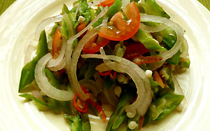 Cut up okra in to very thin slices, cut the red chillies, tomatoes, onion and mix with lime and salt to taste.