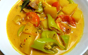 ![]() This is a dish that is often served with bread for breakfast. 1/2 lb Potatoes, peeled and cut into cubes Put a pan on medium flame; add the oil, when the oil is hot add the mustard seeds, cumin, fenugreek and fry till the mustard seeds pop. Next add the chopped onion, green chille, and garlic. Fry till fragrant. Mix the turmeric, curry powder, chillie powder with potatoes. Add to the pan. Stir and cook for a couple of minutes. Add about 1.5 cups of water. Close the lid and cook under low flame till the potatoes are cooked completely. Next add all the other ingredients. Add salt to taste. If the curry is too thick add about 1/2 cup hot water. Cook to a boil, stirring constantly. Serve Hot! This goes well with bread, or string hoppers. *If Goraka is not available, add juice of 1/4 lime just before taking off the heat.