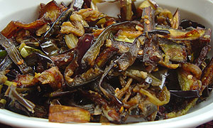 Cut egg plant into thin slices and deep fry, drain and keep aside. fry small onions for about 2mnts and then fry green chillies for about 30 seconds drain and keep aside. Fry fried shrimps for 45 seconds. Then saute crushed red chillies for 15 sedconds and fry rampe and karapincha for about 15 seconds. drain, keep all fried stuff aside. Mix garlic mustard,cardamom,cloves and sugar to gether with vinegar boil for 1 and 1/2 minute. take from fire and put all fried stuff. Add salt to taste. Mix well.Keep till cool. This taste better after one day.