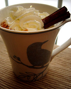 2 cups milk In a heavy saucepan, heat the milk, ground cinnamon and cinnamon stick until simmering. Add the chocolate and let melt. Remove from heat and add vanilla extract. Transfer to mugs and serve with whipped cream. Prep Time: 12 minutes