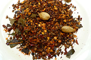 Roast first two ingredients in a heavy skillet under medium flame. After a couple of minutes add the next four ingredients and roast till golden brown. Now add the next four ingredients and roast for few more minutes till fragrant. Take care not to burn. Finally add the chillie pieces roast for a minute or so. Let cool. Grind into a powder using either a mortar with a pestle or coffee/spice grinder. Store in a tight container. This could be kept for up to a year.