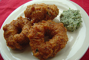 1. Soak urdu dhal in water for 4 hours (not too much water) 2. Add salt, green chilli, ginger, curry leaves and grind in to a paste (not too smooth) 3. Add onion pieces, and cumin seeds and mix well 3. Add baking soda, butter, and wheat flour and mix in to a dough. 4. keep the dough in the fridge for 1/2 hour 5. Make the dough in to balls and flatten them to 1 1/2 cm thick discs and make a hole in the centre of each. Deep fry in hot oil until they are golden brown in color. 6. Drain off excess oil and serve with coconut chutney. 7. Then ENJOY!! P.S. The baking soda and butter will make like donuts and soft in the middle and crispy on the out side. Print this recipe Email this recipe