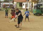 Dec 29 (GI) British tourist Matthew Bain, 12, from Warwickshire, England plays cricket with Sri Lankan boys in a neighborhood of new homes for Tsunami victims on December 27 in Galle. His family came back again after experiencing the Tsunami last year. more..
