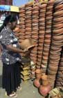 Dec 30 (GI) A woman studies earthenware pots displayed by a vendor at a roadside stall in Colombo. Many Sri Lankans use new utentsils to prepare their first meal of the New Year as the Central Bank reported a better than expected 6.4 percent economic growth