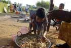 Apr 28 (Reuters) An internally displaced ethnic Tamil child helps her mother cook dinner for other displaced people at Bharati Vidyalayam, a center for refugees, in Trincomalee, April 27, 2006.