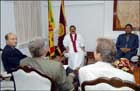 Aug 21 (AP) Sri Lankan President Mahinda Rajapakse, right, talks to Indian cricketer Sachin Tendulkar, left, and Indian team coach Greg Chappell, center, at the president's official residence in Colombo, Sri Lanka, Monday, Aug. 21, 2006.