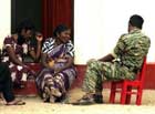 Jan 3 (Reuters) Tamil women from government controlled Jaffna peninsula talk with a Tamil Tiger rebel at a refugee camp run by Kilinochchi Development, Relief and Rehabilitation Organization (KDRRO), in Tamil Tiger held Kilinochchi,