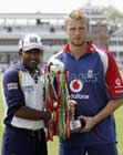 May 11 (GI) Captains Mahela Jayawardene of Sri Lanka and Andrew Flintoff of England pose with the Npower trophy during the England nets session at Lords Cricket Ground on May 10, 2006 in London, England.