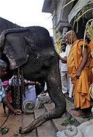 Apr 16 (DL) A Sri Lankan Buddhist monk anoints a temple elephant in the Bellanvila suburb of Colombo on April 15, 2009, as part of the traditional new year rituals. Sri Lanka's majority Sinhalese and minority Tamils, who marked their common New Year on April 14, use anointing as key ritual.