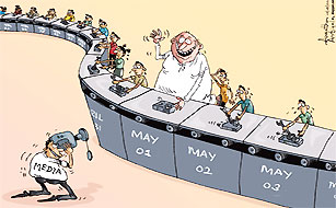 May 3 (Island) Sunday’s downpour may be considered a divine intervention to dampen the enthusiasm of slogan shouting party supporters and disrupt the mega political rallies in Galle and Colombo on the International Workers’ Day. Never have we beheld a pleasanter sight than the servile backers of politicians running helter-skelter looking for shelter. Interestingly, while they were getting drenched to skin their bosses wore amused looks, comfortably seated on roofed platforms.