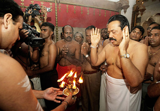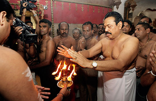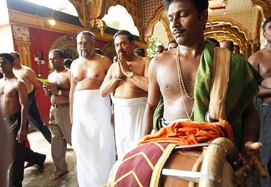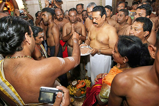 President Mahinda Rajapaksa visited Jaffna for his political campaign in the north of Sri Lanka today, 10th January. He visited Nallur Kovil for Hindu religious observances. He was blessed according to the Hindu traditions by the chief priest of the kovil. The President was seen in bare top, which is a very rare sight in public. EPDP leader and the Minister Douglus Devananda, many politicians, Security personal and large number of devotees and supporters gathered at the ceremony.
