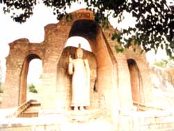 Colossi in Buddhist sculpture could be traced back to the second or third century of the present era with West Asia as its probable place of origin. In the region now known as Bamiyan in Afghanistan there are still insitu Buddhist sculptures which are among the most stupendous of their type. These are the two images of the Buddha in the standing attitude. They measure approx. 112 and 172 feet respectively. They are housed within their own chapels. These two sculptures are covered with a thin plaster of stucco probably to camouflage the rough edges of the natural rock surface, and are finally gilded and polychromed. The walls of their chapels including the ceiling above are lavishly painted with designs of floral and other motifs. There is no doubt that the Bamiyan sculptures of the Buddha would have been a veritable source of inspiration to the early Buddhist artists who happened to cross the Kabul valley which linked the southern branch of the Great Northern Highway referred to in the early Buddhist and Indian texts as the Uttarapatha, the trade route of the then known world which bridged the East and the West on commercial, cultural and political levels. Traders, pilgrims and even men of learning crossed this region in search of various fortunes. It is the opinion of scholars that men from Sri Lanka too had enough links with this region of the ancient world known as Gandhara, although properly speaking Gandhara covers a still vaster area.1 When the Mahasaya or the great pyramidal stupa at Anuradhapura in ancient Sri Lanka was completed by the monarch Dutthagamini (circa 161-137 B.C) it was recorded in the ancient chronicle Mahavamsa that among the many distinguished Buddhist monks who arrived at the final crowning ceremony of the stupa, to grace the occasion were the dignitaries of the monastic establishment of Gandhara. It was the religio-cultural contacts that prevailed between the two regions, namely Sri Lanka and Gandhara which may have led to the borrowing of the ideas pertaining to colossal statues of the Buddha. The first attempt in portraying the Great Sage Sakyamuni Gautama in stupendous form in Sri Lanka was the statue that is known as the Avukana Buddha. Recent researches by archaeologists and art historians in Sri Lanka have enabled them to distinguish a close similarity between the very mane Avukana and the Bamiyan region which was referred to in ancient times variously as Vokkana, Avakana, or Vakana and in early Chinese literature as O-po-kini. It has been surmised that the above toponyms, which were used in early Buddhist Prakrit and Chinese literature with reference to this particular region now known as Afghanistan (wherein Bamiyan is situated), bear a close similarity between the word Avukana, hence could have been responsible in deriving the name used in reference to the particular colossus in Sri Lanka which very much resembles the Bamiyan colossi.2 The colossal Buddha statues of Bamiyan were sculpted by those who advocated Mahayana Buddhism. It was in Mahayana Buddhism that the concept of Buddha was elevated to a position of more a god-head than a human being. According to Mahayana the Buddha was not merely a sage who achieved Supreme Enlightenment (Sambodhi) through a progressive development of mental culture (bhavana) but a saviour of all human and divine beings. Sakyamuni the historical Buddha was only an apparitional form emanated from the Eternal Buddha Amitabha or Amitayus who resides in the highest heaven Sukhavati. The portrayal of the Buddha figure in superhuman qualities was an attempt to emphasise the soteriological aspect of Buddhahood, hence the origin of the titanic image of the Buddha, first in Bamiyan which was a part of the Gandhara region where Mahayana Buddhism was supposed to have had its origin. It was natural that this concept of portraying the Buddha in super human qualities had gained currency wherever Mahayana Buddhism spread and Sri Lanka after the third or the fourth century of the present era was no exception to this. The Avukana Buddha image in Sri Lanka has many similar features to those of the Bamiyan colossi. It depicts in the right hand which is raised towards the right shoulder and palm spread, the gesture known as abhaya mudra which indicates that the votary is protected from all fears (bhaya) mundane or supramundane, hence a+bhaya, that is no+fear. The left hand too is shown raised and touching the left shoulder. The palm of the left hand is turned towards the Buddha. This is a gesture indicating the votary to seek after the Buddha for release form sentient bondage (samsara). The Buddha stands erect on a lotus pedestal and is housed within a shrine of equal enormous dimensions as the remains of its foundations indicate today. Miniature metal images of the gods of the Hindu pantheon have been found below the feet of the Buddha image. This has been interpreted as an attempt to show that the Buddha is above all gods or titans of other popular Indian religions. The Avukana Buddha image approximately 43 feet in height is the archetype of colossal Buddha images that have been sculpted by the ancient Sinhalese of Sri Lanka. Although it is sulpted in high relief and the back of the figure in not separated from the rockboulder out of which the figure is hewn, the Avukana image looks more like an image sculpted in the round. A limestone statue of the Buddha sculpted in the round and measuring approximately 52 feet, with its lotus pedestal, is found in a badly ruined state in the jungle thickness of an ancient site known as Maligavela in south Sri Lanka. Its lotus pedestal lies a few yards away from it arid another massive image of a Bodhisattva, a divine being belonging to the Mahayana Buddhist pantheon too is found close by lying flat on the ground. Since almost all the colossal standing Buddha images in Sri Lanka as well as those in other countries are sculpted in heigh relief, this particular image which is sculpted fully in the round i