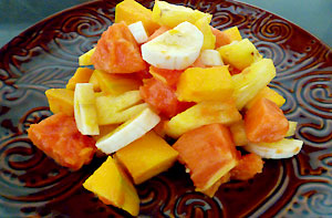 1 ripe pineapple, peeled, cored and cut into 1 inch cubes 1 ripe papaya, peeled and cut into 1 inch cubes *** 2 ripe mangoes, peeled and cut into 1 inch cubes 1-2 ripe bananas, sliced 1 tsp lime juice 2 tbsp honey *