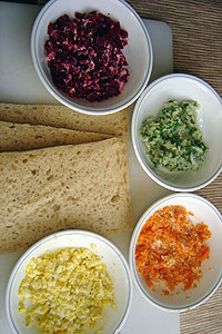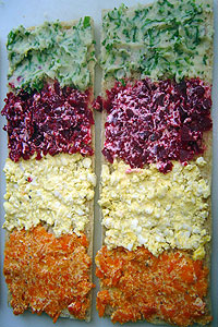 Add carrot, beet root, potatoes, and egg into the separate butter portions.